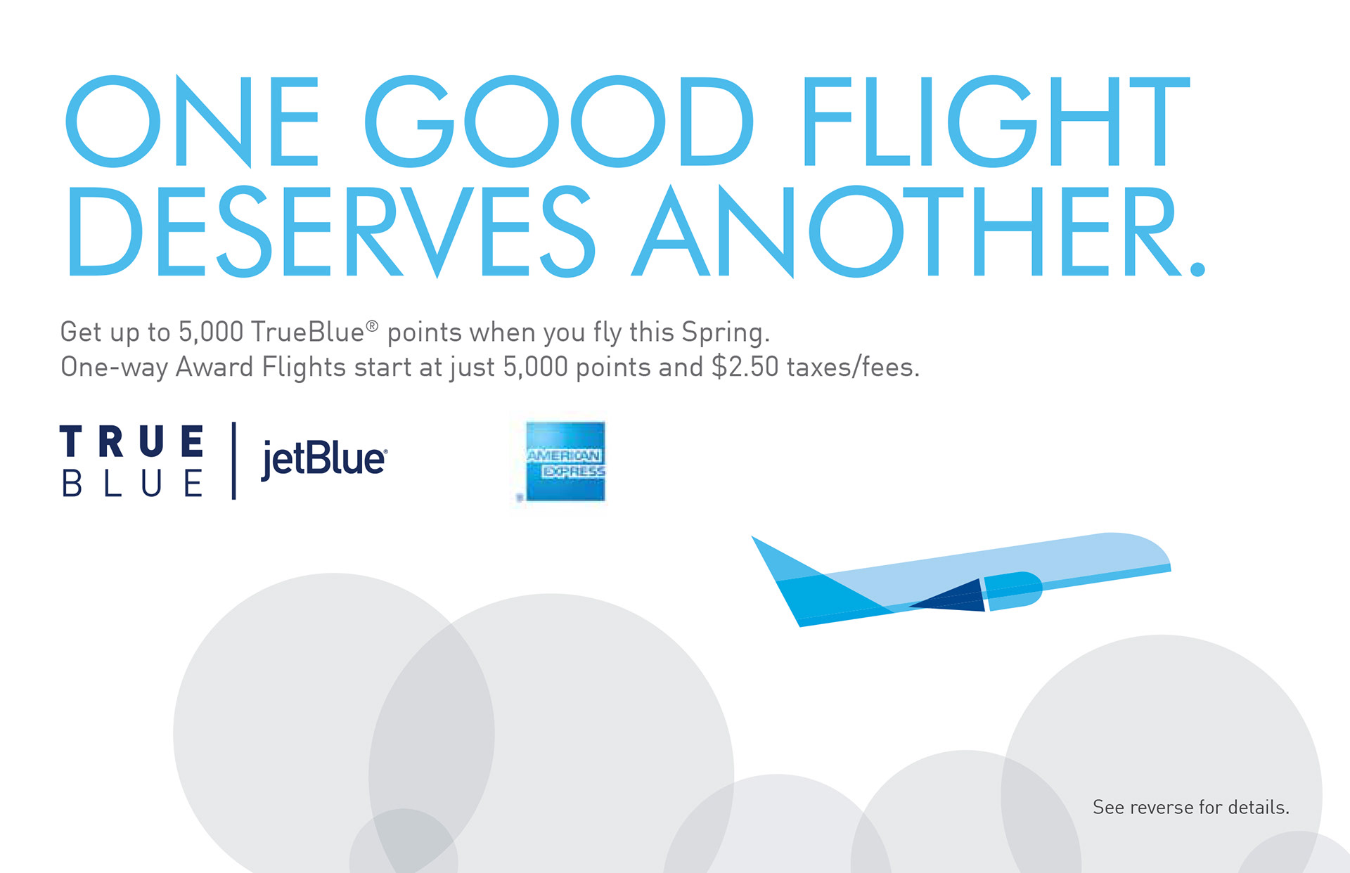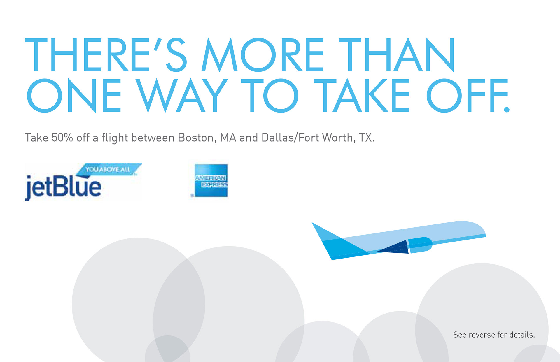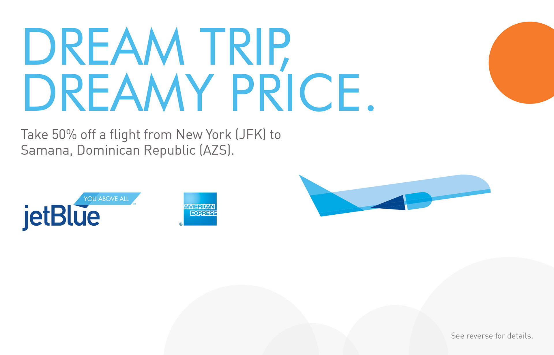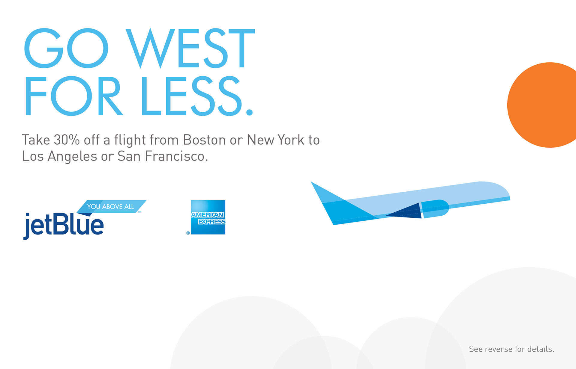 Series of postcards promoting JetBlue discounts and loyalty program bonuses to American Express Card members.